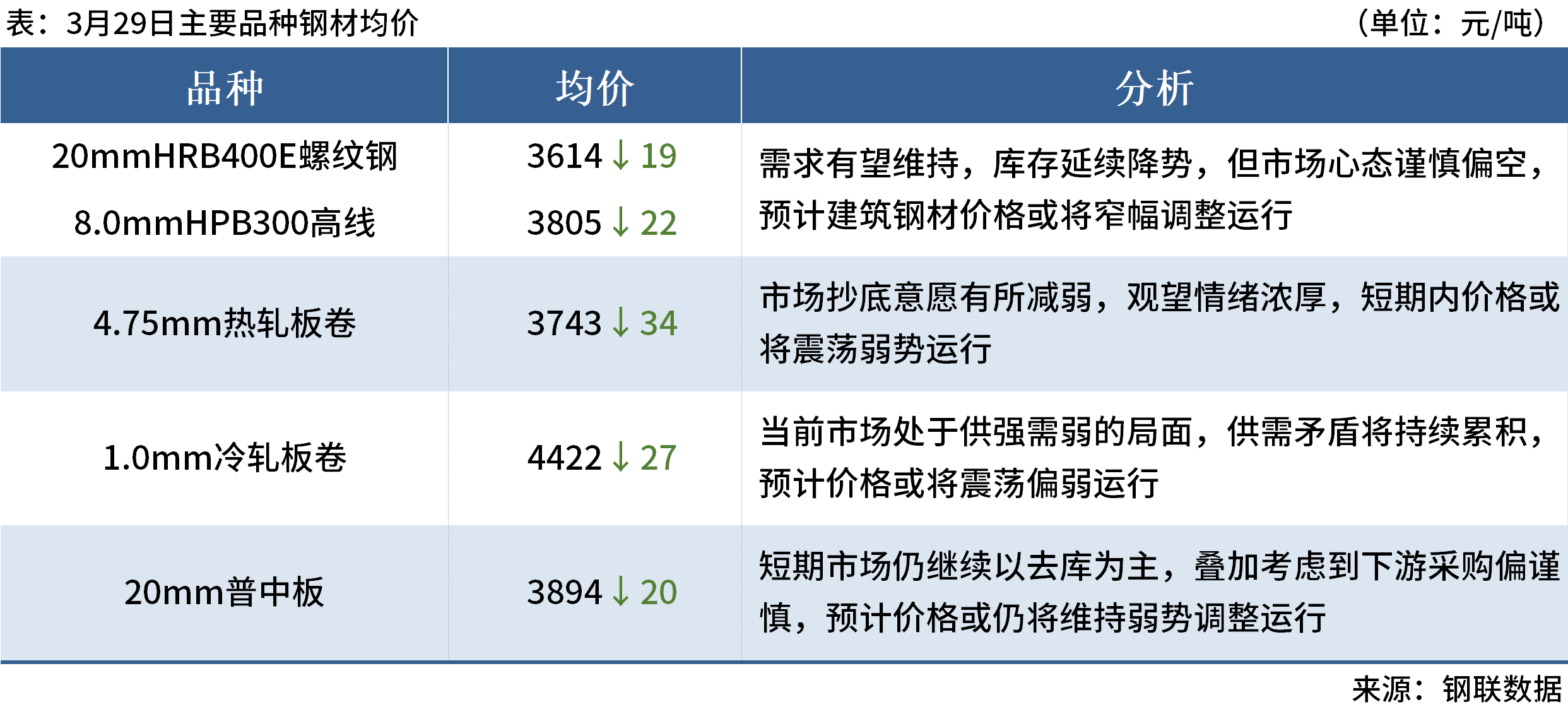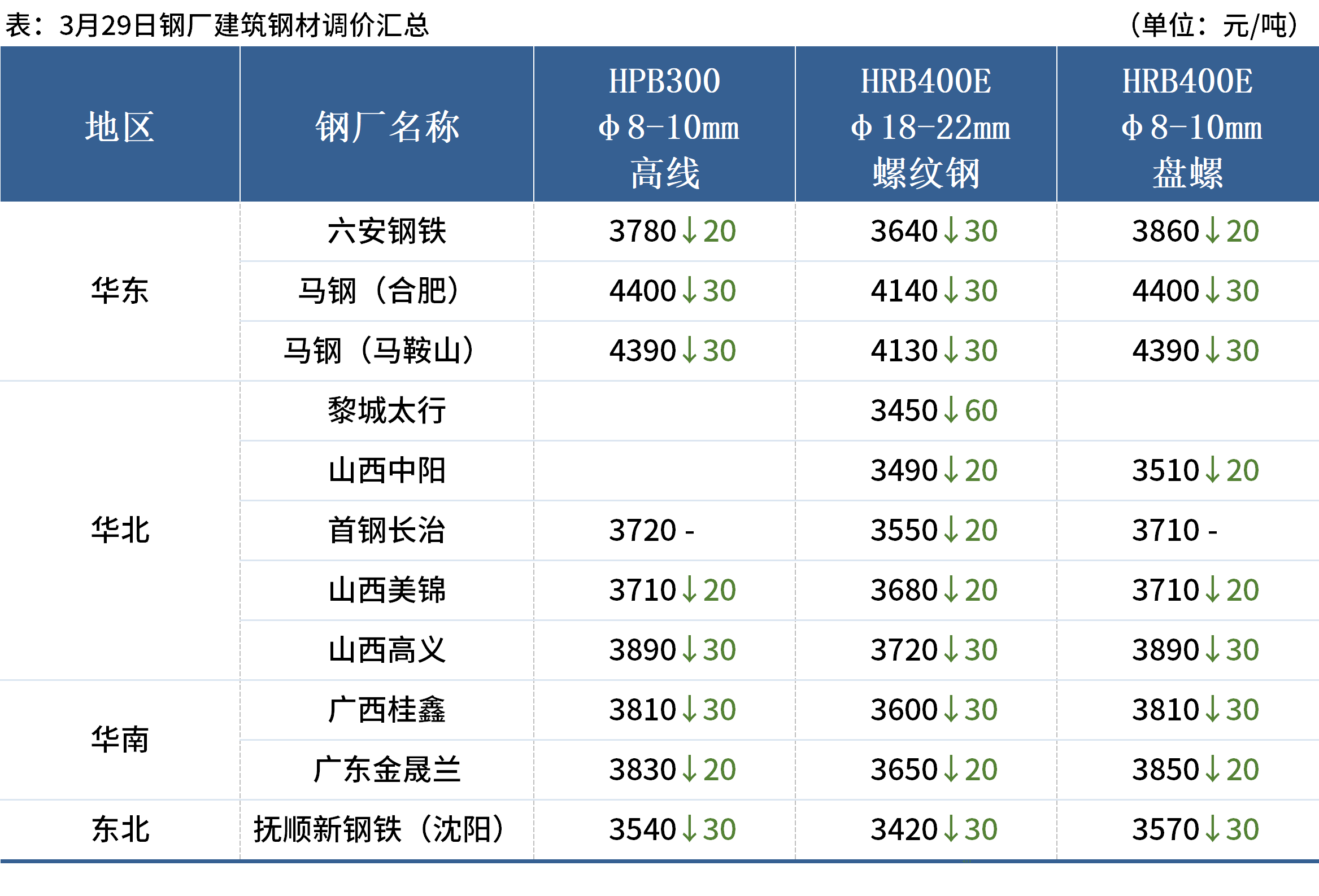 ◎3月31日中天钢铁出台4月上旬出厂价,螺纹下调100元/吨、线材盘螺下调100元/吨,现华东螺纹3600元/吨、线材盘螺3900元/吨。