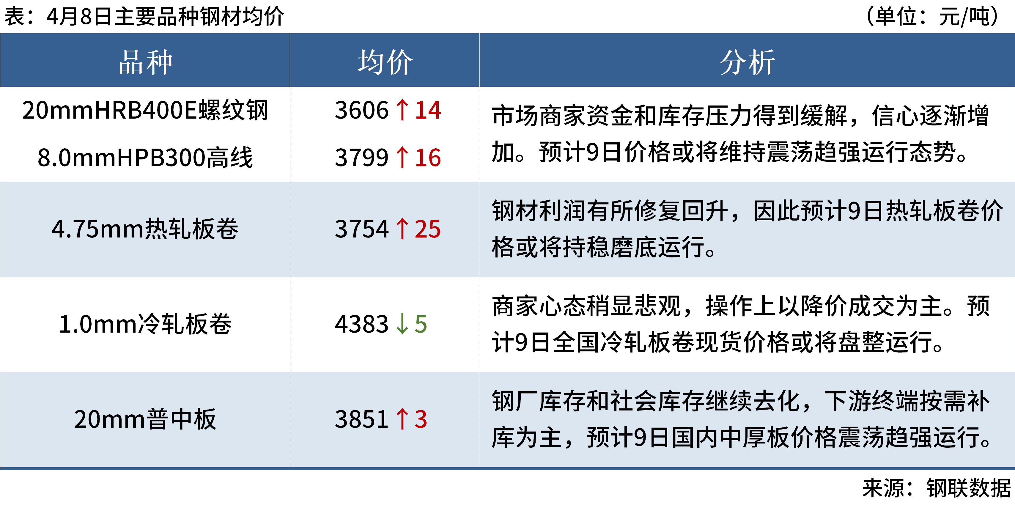 ◎ 4月8日,全国主港铁矿石成交163.20万吨,环比增435.1%;237家主流贸易商建筑钢材成交19.96万吨,环比增73.7%。