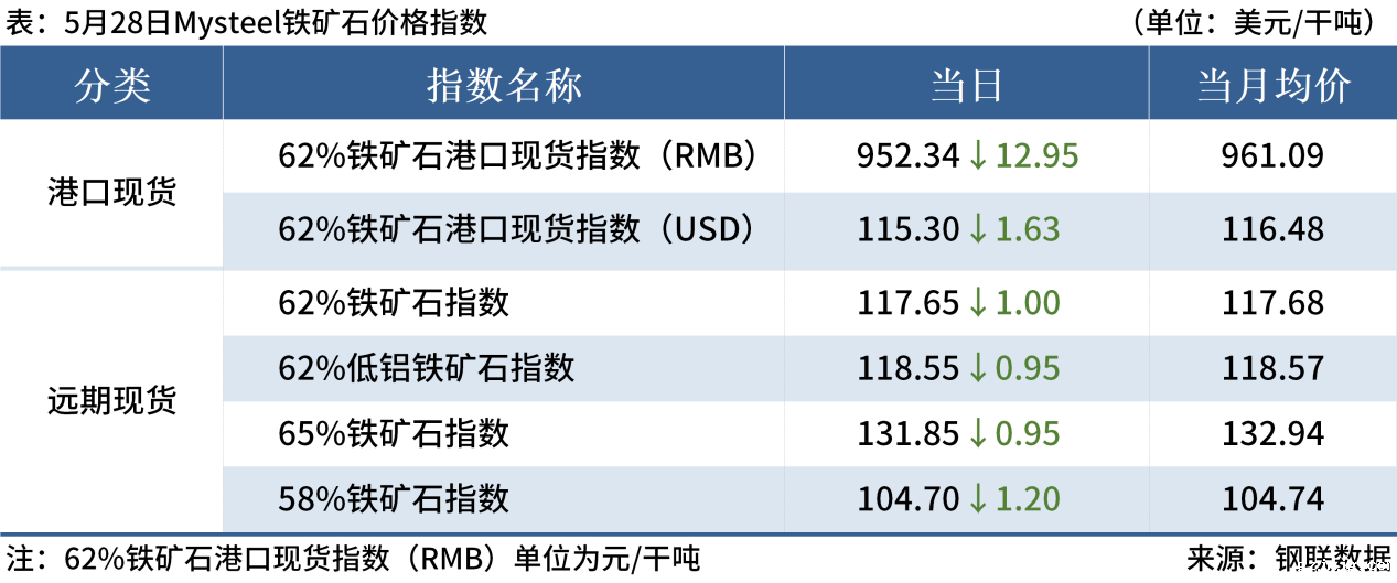 ◎ 5月28日,全国主港铁矿石成交105.60万吨,环比增46.3%;237家主流贸易商建筑钢材成交12.22万吨,环比减1.1%。