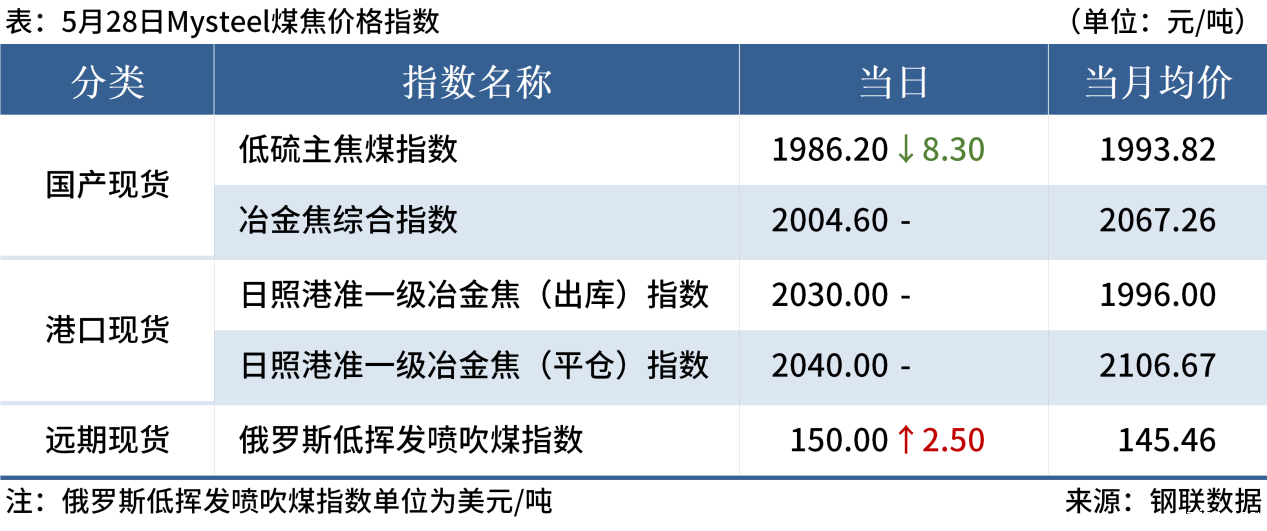 ◎ 5月28日,鄂尔多斯市场个别焦企计划调整焦炭价格,干熄焦上调110元/吨,湿熄焦上调100元/吨,自5月30日0时起执行。