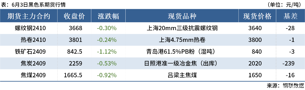 ◎6月3日,全国主港铁矿石成交73.50万吨,环比减17.1%;237家主流贸易商建筑钢材成交10.88万吨,环比减6.4%。