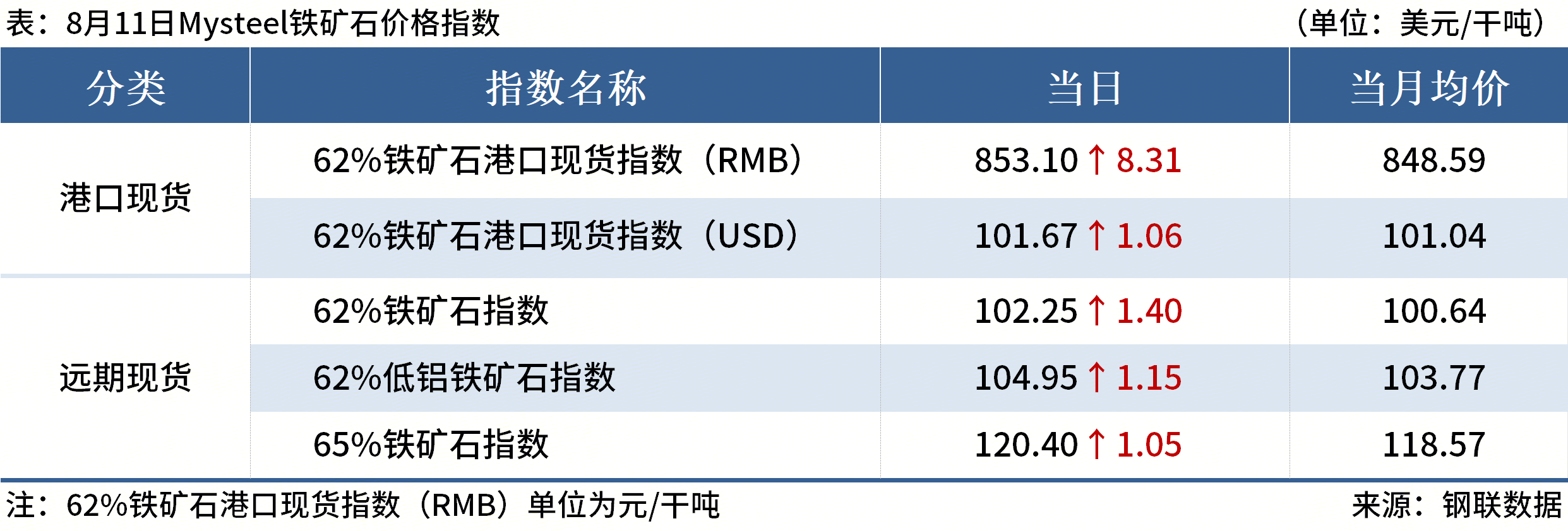 ◎8月11日,全国主港铁矿石成交123.60万吨,环比增77.3%;237家主流贸易商建筑钢材成交12.23万吨,环比增30.7%。