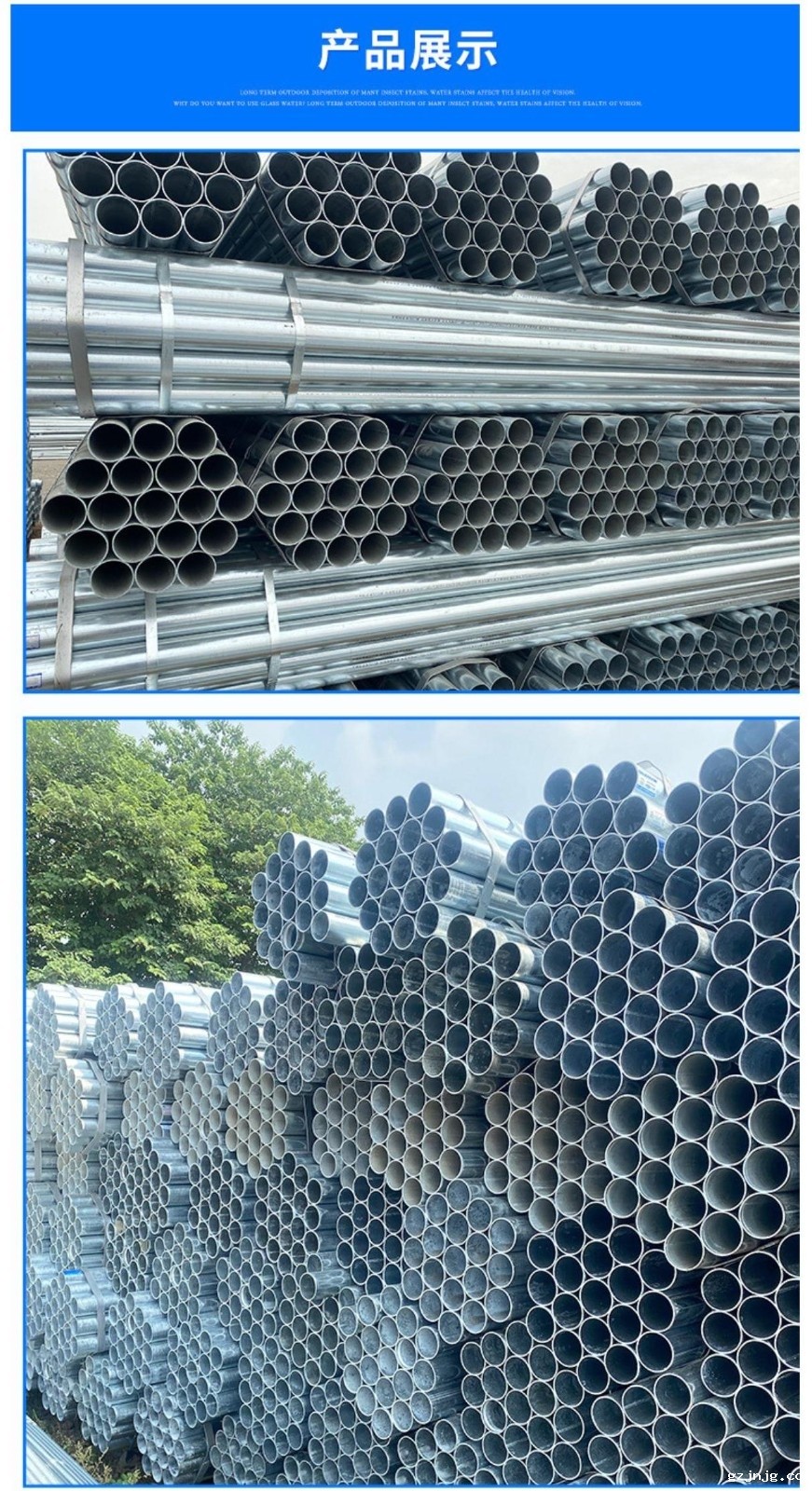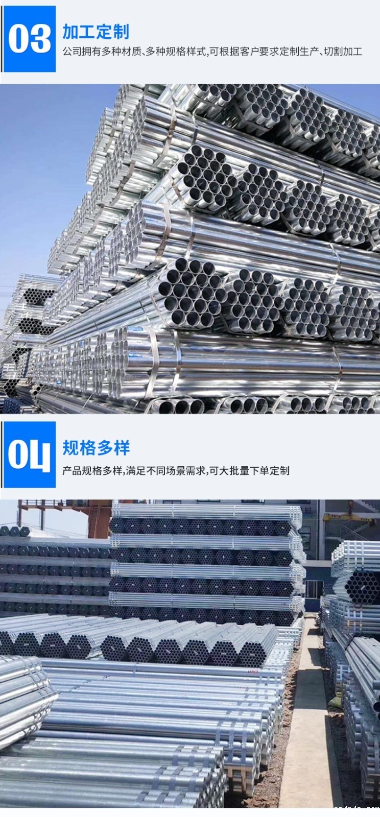 镀锌钢管表面有热浸镀或电镀锌层的焊接钢管。镀锌可增加钢管的抗腐蚀能力,延长使用寿命。镀锌管的用途很广,除作输水、煤气、油等一般低压力流体的管线管外,还用作石油工业特别是海洋油田的油井管、输油管,化工焦化设备的油加热器、冷凝冷却器、煤馏洗油交换器用管,以及栈桥管桩、矿山坑道的支撑架用管等。