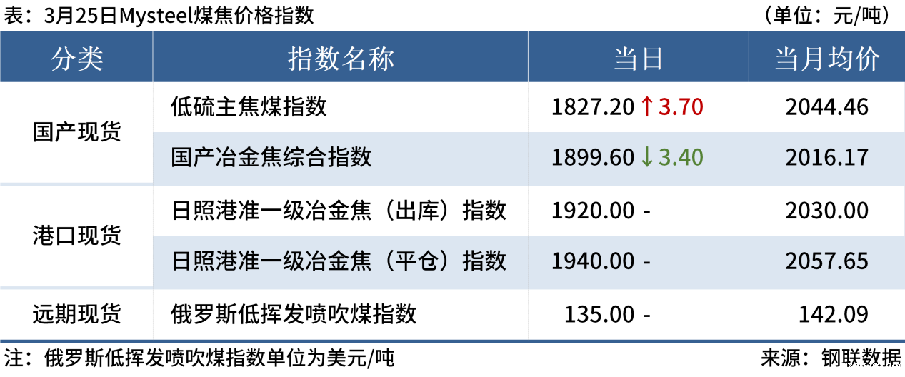 ◎ 截至3月25日,澳大利亚焦煤一线峰景CFR价格261.5美金/吨,较上周同期相比下跌27.5美金/吨,LV二线焦煤CFR价格222.5美金/吨,较上周同期相比下跌26.5美金/吨。详情>>