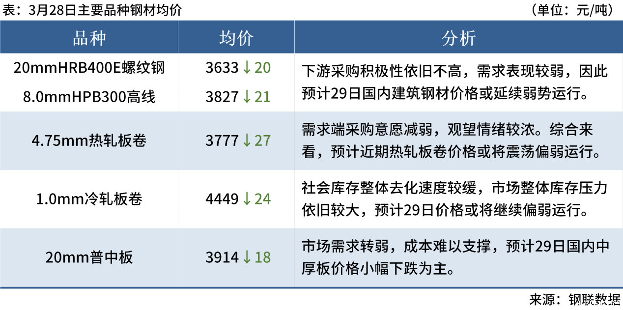 ◎ 3月28日,江苏沙钢废钢采购价格下调50元/吨,重三含税2700元/吨,炉一含税2780元/吨,年累计涨跌幅为-360元/吨。
