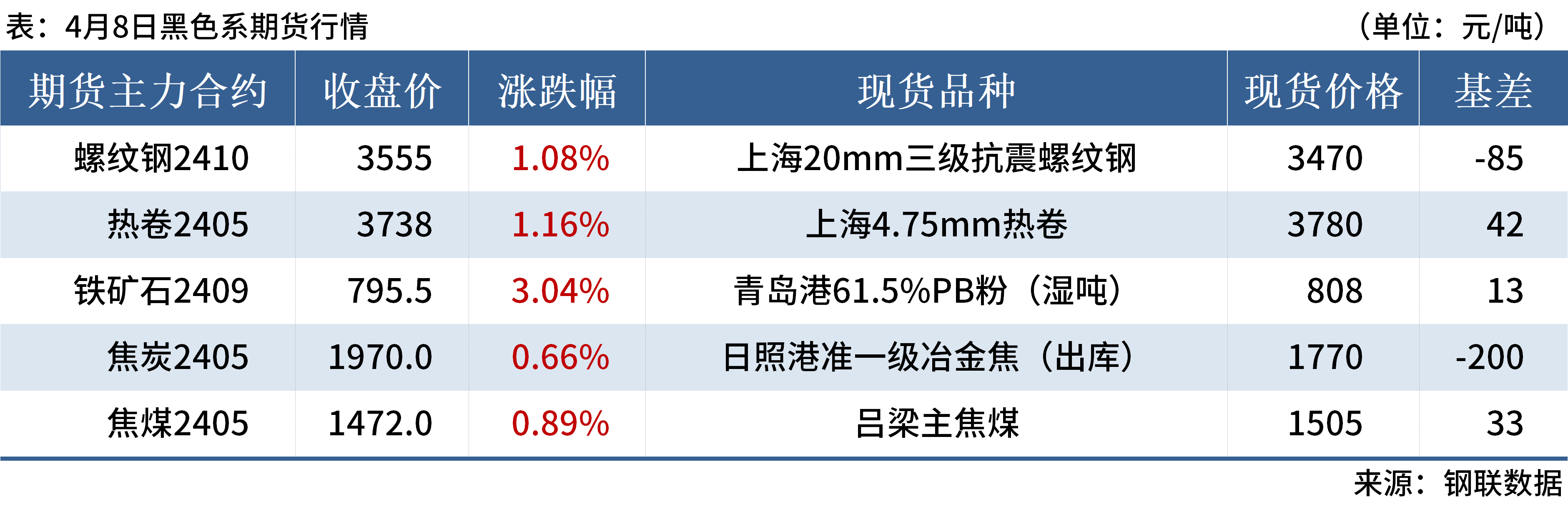 ◎ 4月8日,全国主港铁矿石成交163.20万吨,环比增435.1%;237家主流贸易商建筑钢材成交19.96万吨,环比增73.7%。
