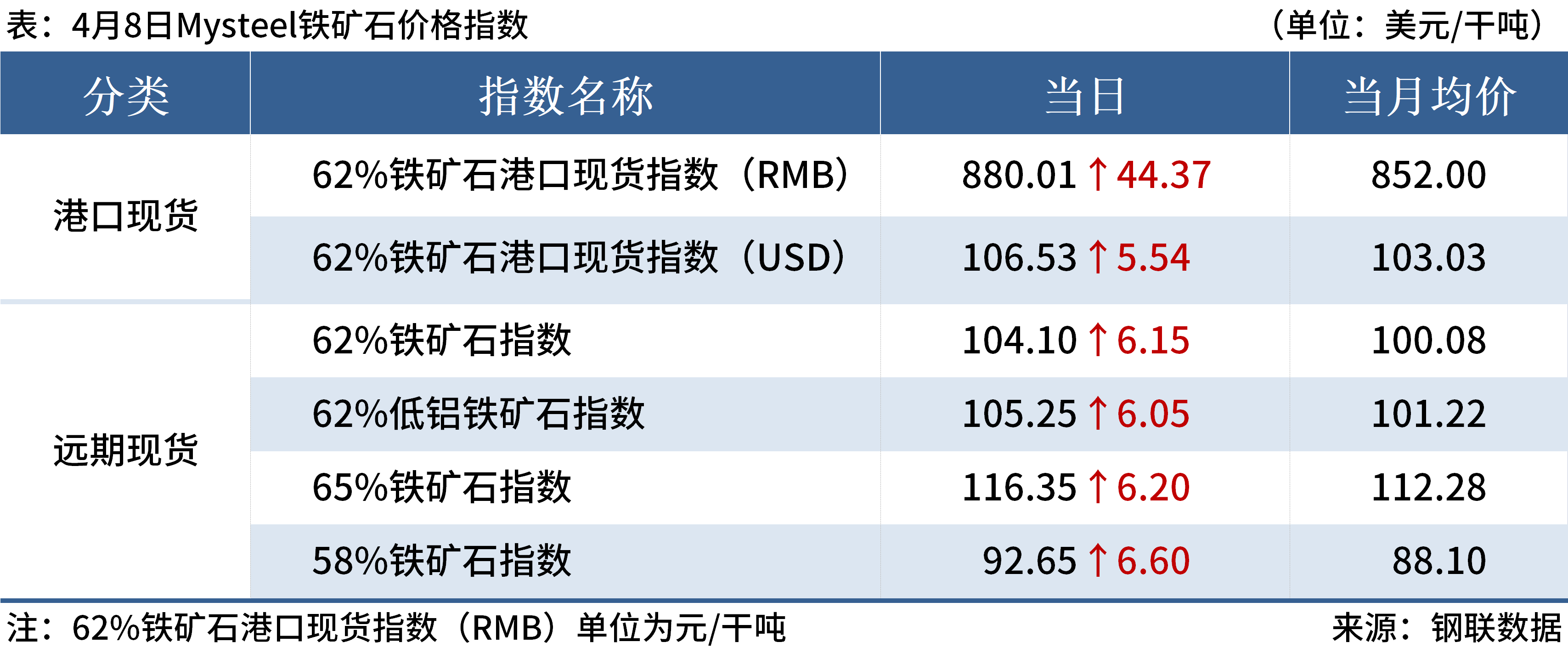 ◎ 4月8日,Mysteel 62%铁矿石指数104.1涨6.15,月均100.08;65%铁矿石指数116.35涨6.2,月均112.28。(单位:美元/干吨)