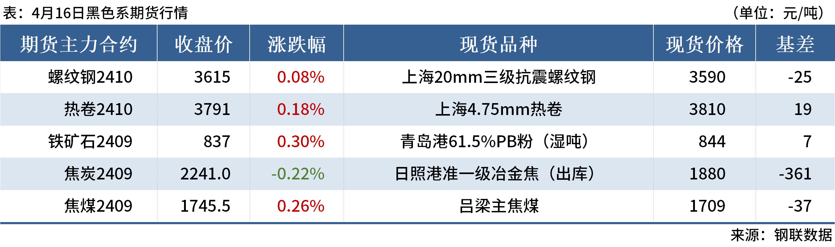 ◎4月16日,全国主港铁矿石成交92.30万吨,环比减11.2%;237家主流贸易商建筑钢材成交14.58万吨,环比减12.8%。