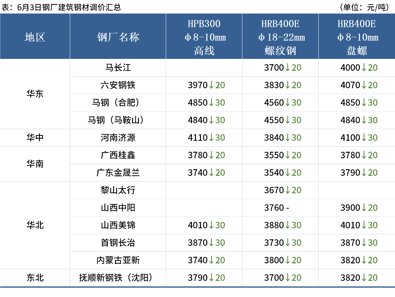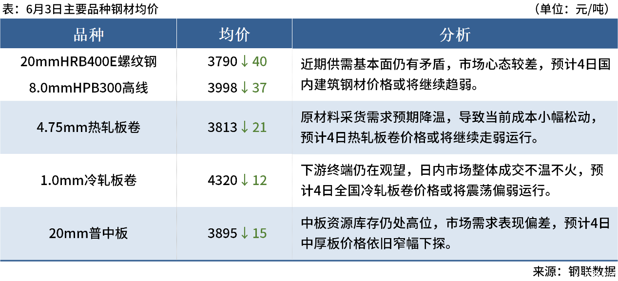 ◎6月3日,全国主港铁矿石成交73.50万吨,环比减17.1%;237家主流贸易商建筑钢材成交10.88万吨,环比减6.4%。