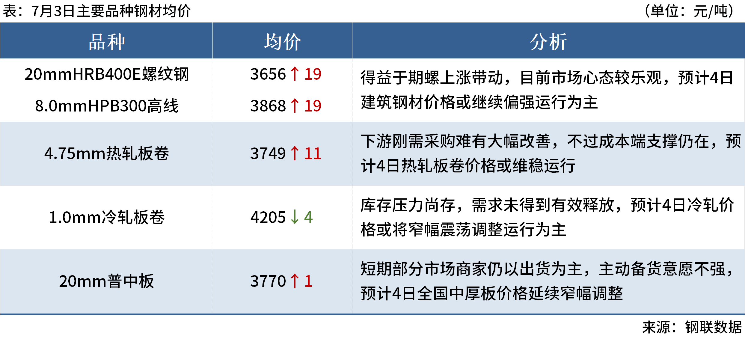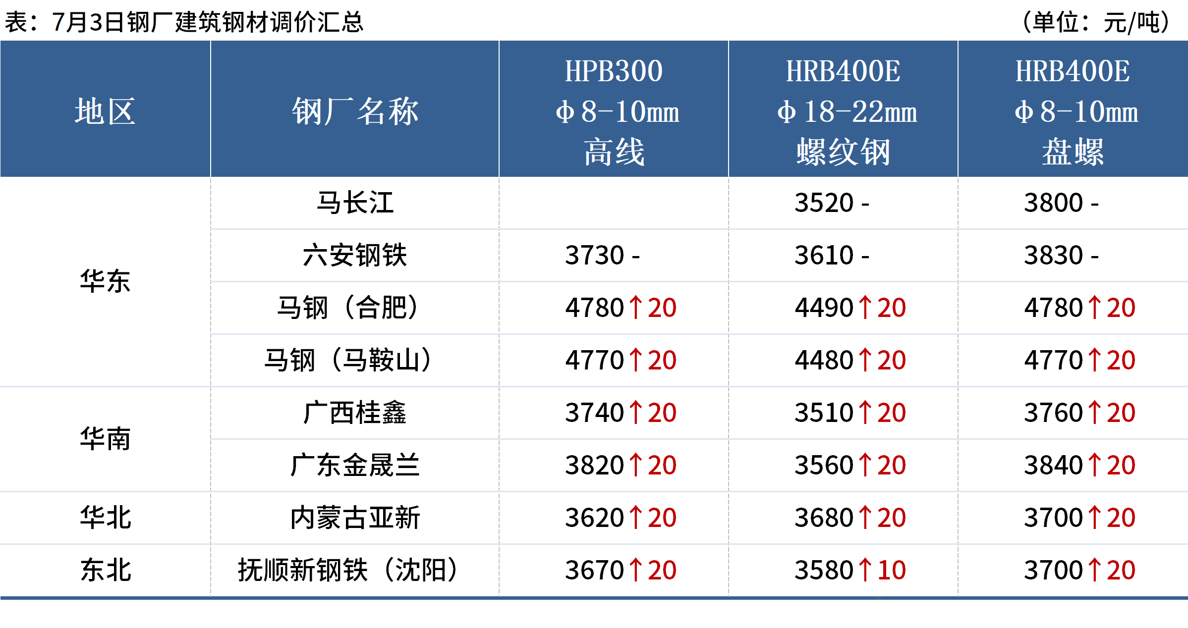 ◎7月3日,5家钢厂上调建筑钢材出厂价10-20元/吨。