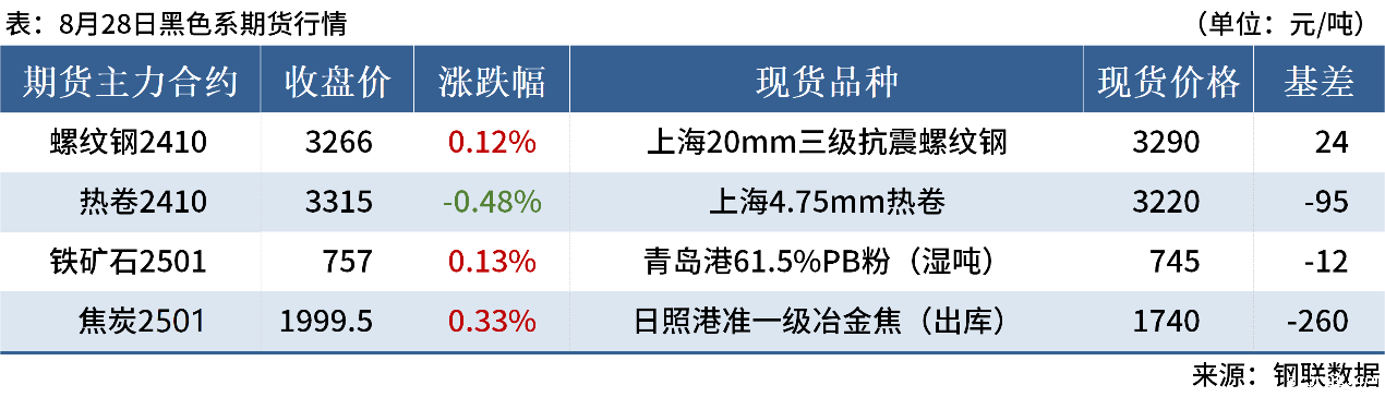 ◎8月28日,河北、山东等地部分钢厂对焦炭采购价提出第七轮降价,湿熄焦降50元/吨,干熄焦降55元/吨。