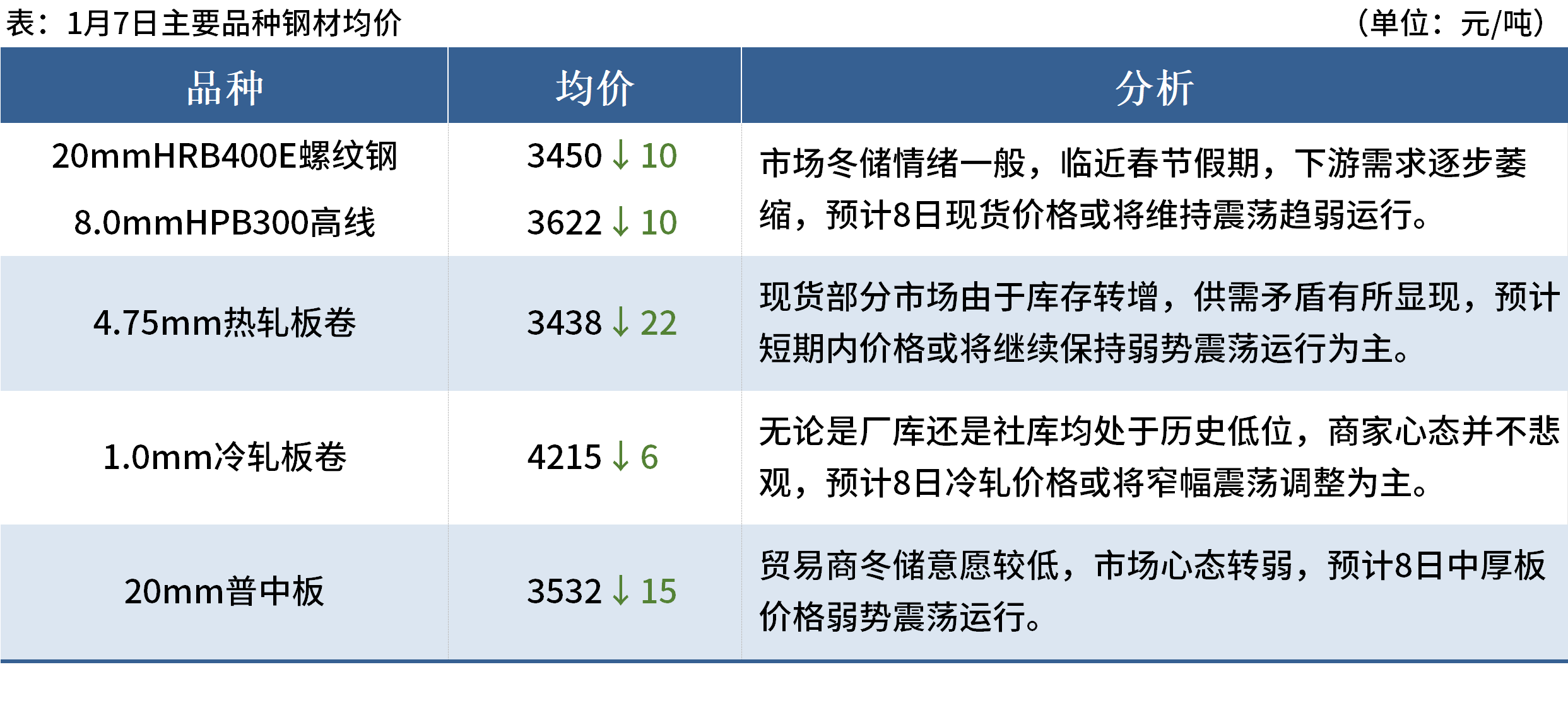 ◎1月7日,76家独立电弧炉建筑钢材钢厂平均成本为3437元/吨,日环比减少12元/吨。平均利润亏损29元/吨,谷电利润为95元/吨,日环比减少1元/吨。